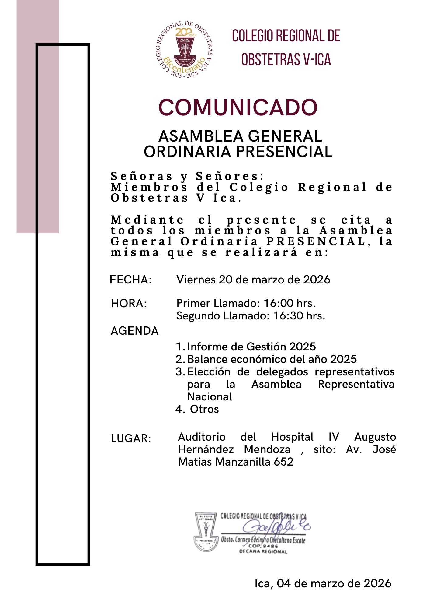 DECANA DEL COLEGIO REGIONAL DE OBSTETRAS DE ICA
