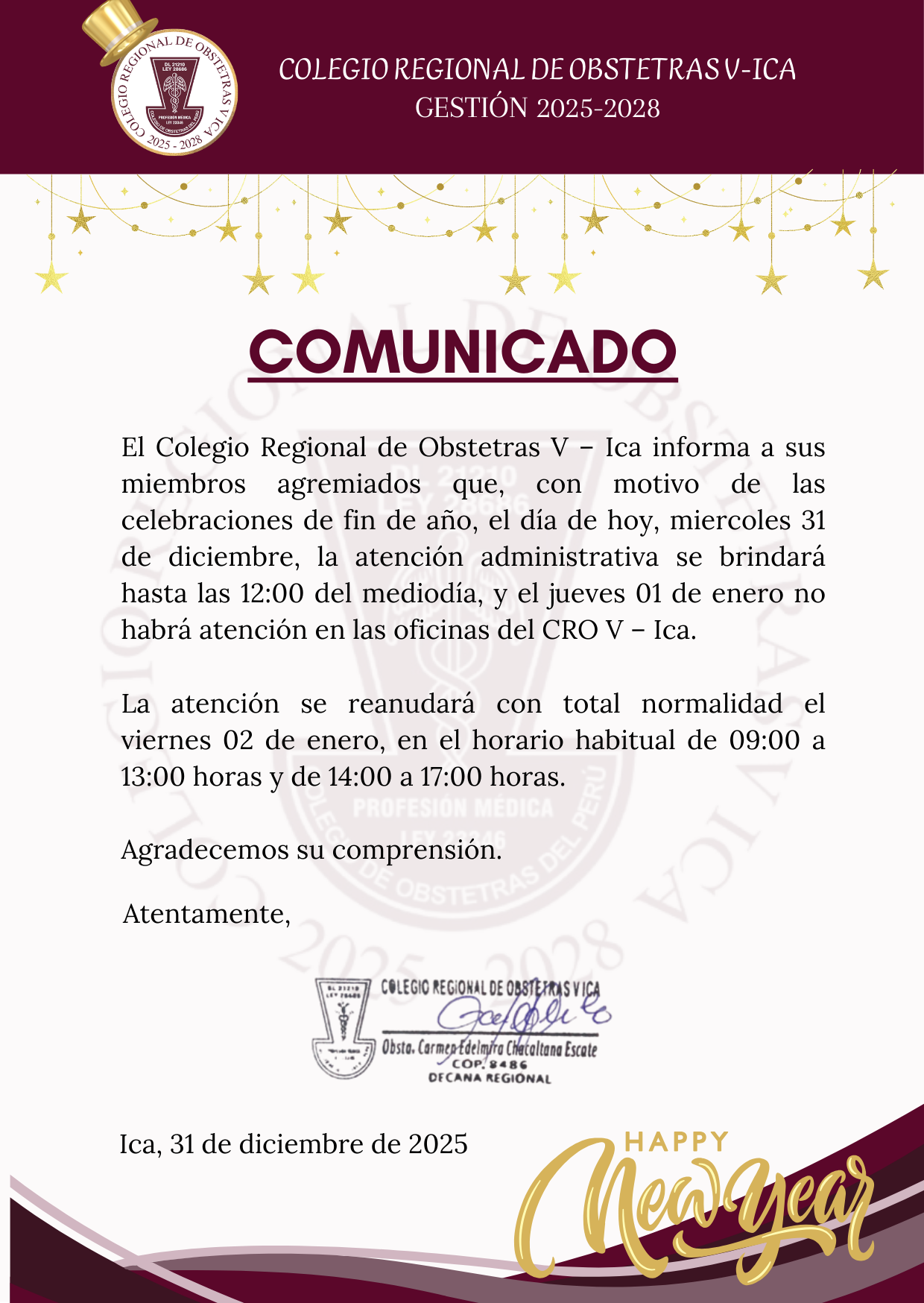 El Colegio Regional de Obstetras V – Ica informa a sus miembros agremiados que, con motivo de las celebraciones de fin de año, el día de hoy, miércoles 31 de diciembre, la atención administrativa se brindará hasta las 12:00 del mediodía, y el jueves 01 de enero no habrá atención en las oficinas del CRO V – Ica.