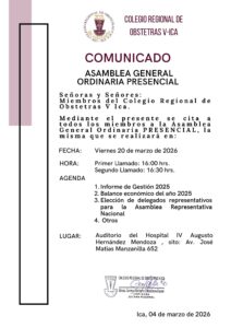 El Colegio Regional de Obstetras V – Ica informa al público en general que la cuenta bancaria de la Caja Municipal Ica a nombre de la Decana y de la Tesorera Regional ha sido desactivada.